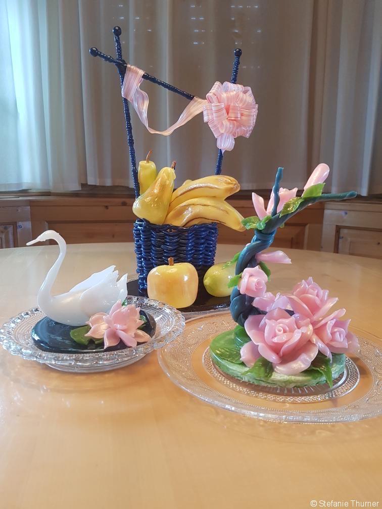 Der Unterschied zwischen Kuchen und Torte ist übrigens simpel. Bei Kuchen werden die Zutaten gebacken, fertig. Bei Torten werden die gebackenen Teile weiter verarbeitet. Sie werden gefüllt, mit Marzipan umhüllt, mit flüssiger Schokolade begossen, mit Sahne verziert. Es gibt zig Möglichkeiten. Steffi erinnert sich an ein besonderes Exemplar: eine Baumrindentorte für eine Hochzeit. „Drei Stockwerke hoch. Außen sollte sie wie eine Birkenrinde aussehen.“ Eine Challenge. Aber machbar. „Mit jeder Menge weißem Rollfondant und schwarzer Lebensmittelfarbe. Damit haben wir die Maserung gepinselt“, grinst Steffi.