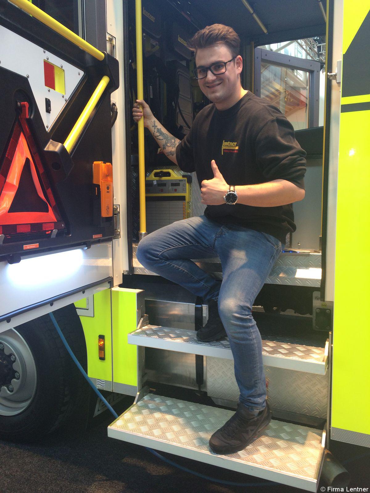 Mit 15 Jahren begann er sich bei der Freiwilligen Feuerwehr zu engagieren. Das Thema ließ ihn nicht mehr los. Was lag da näher, als sich bei der Firma Lentner zu bewerben? Die Firma kannte er schon von seinem Vater, der hatte sich dort als Dachdecker um die Hallendächer gekümmert. In dem riesigen neongelben Ausstellungswagen der Firma Lentner ist die komplette Innenausstattung handwerklich gefertigt und passgenau und nach Normangaben eingebaut.