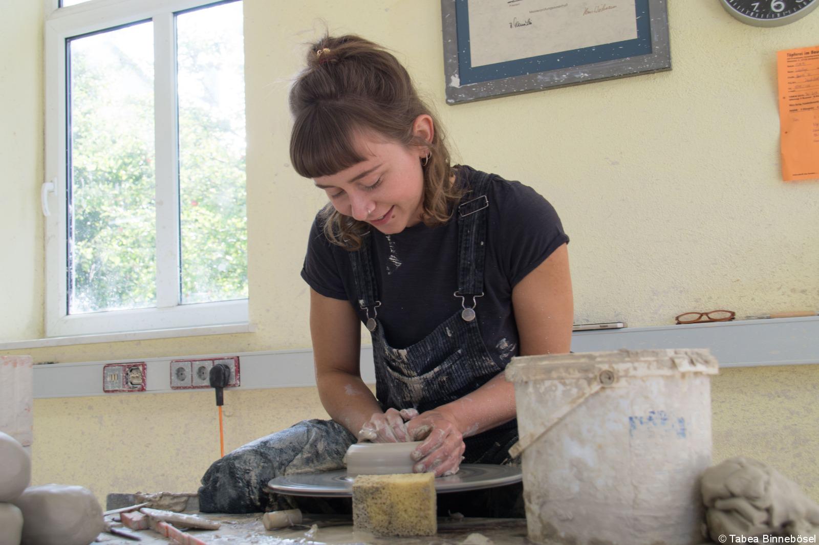 In der Werkstatt geht es natürlich viel ruhiger zu. Viele Arbeitsschritte sind notwendig, bis eine Keramik fertig ist. Die Herstellung beginnt damit, den Ton anzumachen. „Alte Tonreste und neue Tonmasse werden im Tonschneider geknetet und homogenisiert, damit sie gut formbar ist“, erklärt Lisa. Je nachdem, ob sie eine Tasse, eine Vase, ein Kännchen oder ähnliches herstellt, wiegt sie den Ton für das jeweilige Produkt ab: zum Beispiel zehn Portionen á 400 Gramm. Anschließend geht es damit auf die Drehscheibe. „Wichtig ist, den Ton zu Beginn der Formgebung in der Mitte der Drehscheibe zu zentrieren“, weiß Lisa. „Sonst wird alles schief“, lacht sie. Das macht aber nichts, denn dann fängt man halt nochmal an.