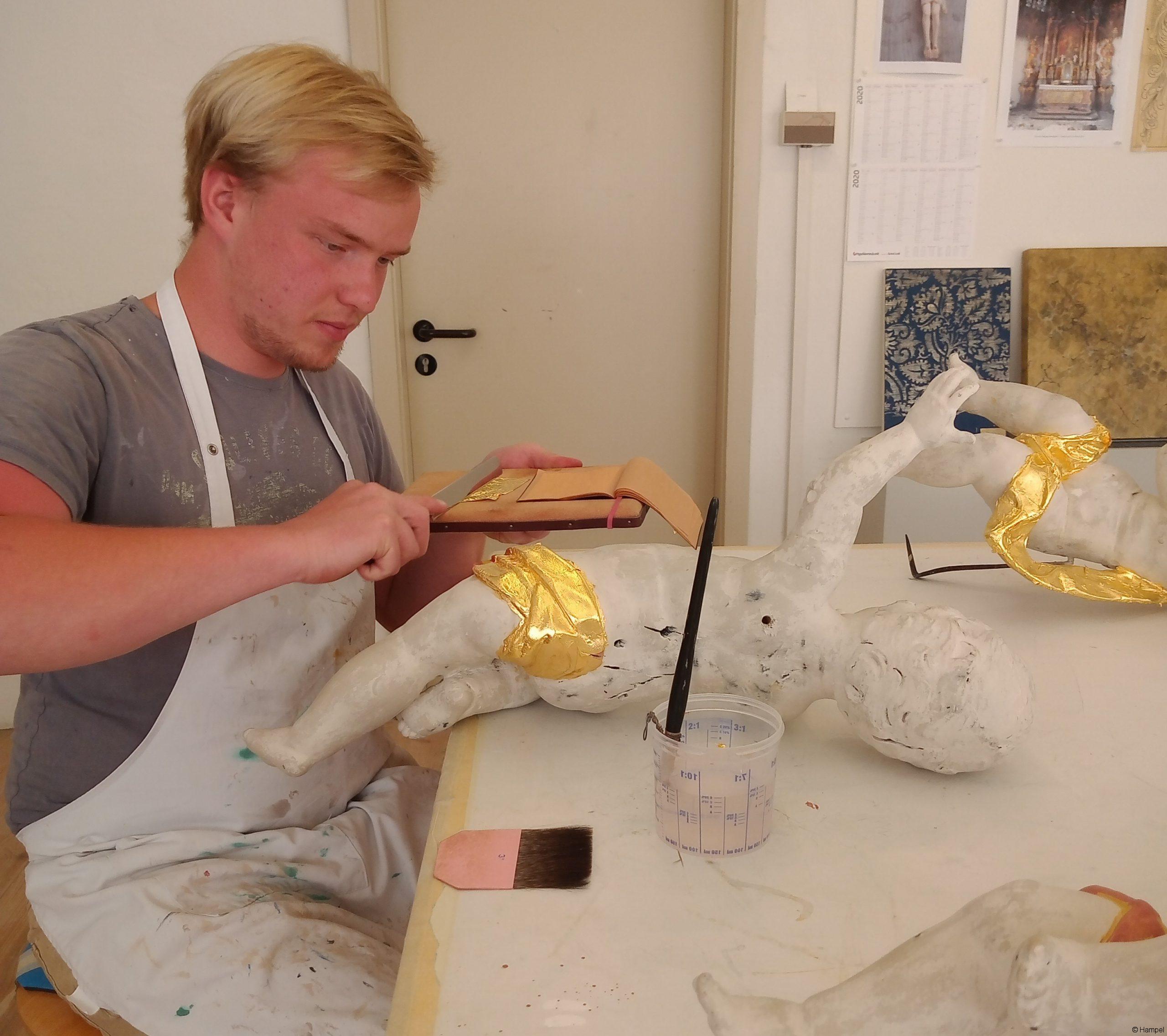Auf das Vergolden wird in der Ausbildung zum Kirchenmaler großen Wert gelegt. Der Beruf umfasst aber noch viel mehr. „Im Grunde setzen wir fast alles instand, was es in einer Kirche gibt: von den Fresken an den Wänden über geschnitzte Figuren bis hin zu den Altären und dem Gestühl.“ Immer kommt eine andere Technik zum Einsatz. Bei den Wandmalereien zum Beispiel benutzt Florian spezielle Pigmentfarben. „Damit die Bilder genauso aussehen wie ursprünglich, wird jeder Farbton extra angemischt“, erklärt er.