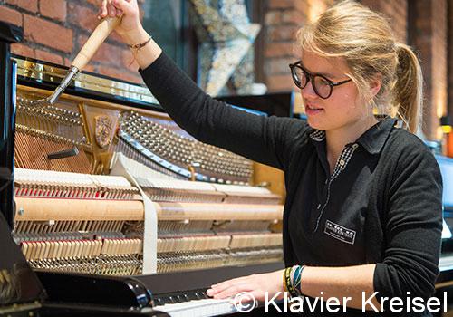 Ein Musikinstrument zu spielen, ist keine Voraussetzung für die Ausbildung. Es macht das Ganze nur interessanter. Auch ein musikalisches Gehör braucht man nicht unbedingt. „Das lernt man“, sagt Florian. Von Anfang wird jeden Tag trainiert. Das Stimmen macht einen wesentlichen Teil der Arbeit aus. „Ich hätte nicht geglaubt, wie anstrengend das ist“, erzählt Tanja. Kein Wunder: Die Wirbel beim Klavier sind eher schwergängig, die Saitenlage insgesamt ist widerborstig – ganz anders als bei der Violine oder dem Cello. Da braucht es für den Klavierbauer Geduld und Ausdauer. Umso schöner das Gefühl, wenn man es doch gut hinbekommen hat. Plötzlich klingen die Stücke wieder harmonisch. Die Tasten laufen gleichmäßig, das „e“ hakt nicht mehr. Die Freude der Kunden ist für Florian und Tanja das größte Geschenk.