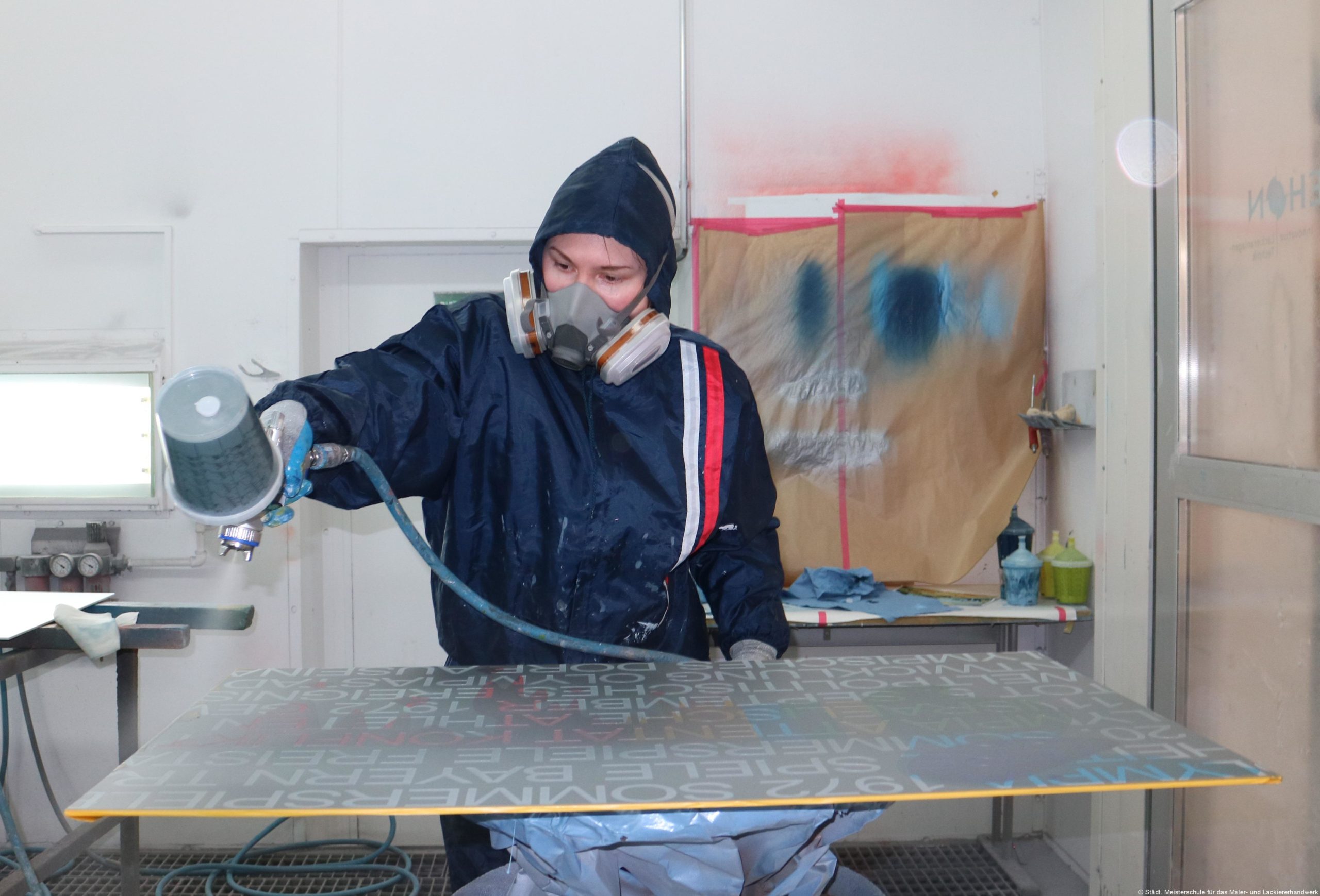 Die Platten wurden schichtweise lackiert. Dazu haben wir Plots – Klebefolien – von den Motiven oder Teilmotiven erstellt, diese auf die Platten aufgeklebt und mit Lack ausgenebelt. Nach dem Trocknen haben wir sie dann wieder abgezogen. Je nach Motiv waren mehrere Arbeitsgänge notwendig. Die Schrift kam ganz zuletzt drauf. Insgesamt haben wir drei bis vier Wochen an den Bildern gearbeitet.