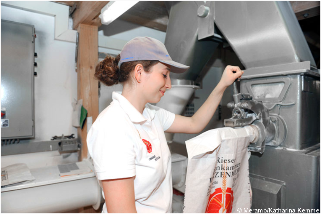 Heute haben wir es mit einer echten Königin zu tun. Genauer gesagt mit der amtierenden Bayerischen Mehlkönigin. Carolina Göggerle ist 20 Jahre alt und kommt aus dem schwäbischen Laub im Donau-Ries Kreis. Mit dem historischen Bild des Müllers, der „wie in Max und Moritz“ Mehlsäcke von A nach B schleppt, will sie als derzeitige Botschafterin rund um Getreide und Mehl ein- für allemal aufräumen. Die Müllerstochter hat von klein auf in der elterlichen Mühle mitbekommen, was es bedeutet, Verfahrenstechnolge/-technologin in der Mühlen- und Futtermittelwirtschaft zu sein, wie der Ausbildungsberuf offiziell heißt. Sie selbst hat die Müller-Ausbildung von A bis Z durchlaufen.