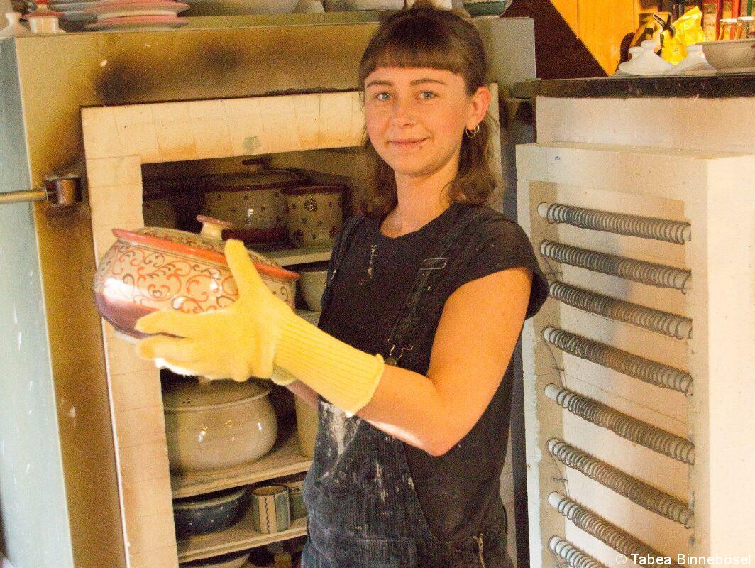 „Je nachdem, wie viel Heizleistung ich haben möchte, werden die Öfen unterschiedlich aufgebaut“, erklärt Konstantin und ich erfahre: Es gibt Warmluftöfen, Speicher- und Grundöfen. Bei den Warmluftöfen strömt kalte Luft ins Innere des Ofens, wird dort erwärmt und kehrt dann aufgewärmt in den Raum zurück. Speicheröfen sind dagegen darauf ausgelegt, einen Teil der Wärme zu speichern und erst nach einiger Zeit an die Umgebung abzugeben. Die Grundöfen sind die Heizmonster unter der Öfen. Sie haben einen super massiven Speicherkern und eine ausgeklügelte Abgasführung. „Deswegen braucht ein Grundofen einige Stunden, bis er voll aufgeheizt ist. Dafür hält er bis zu 20 Stunden warm“, meint Konstantin mit einem Augenzwinkern.
