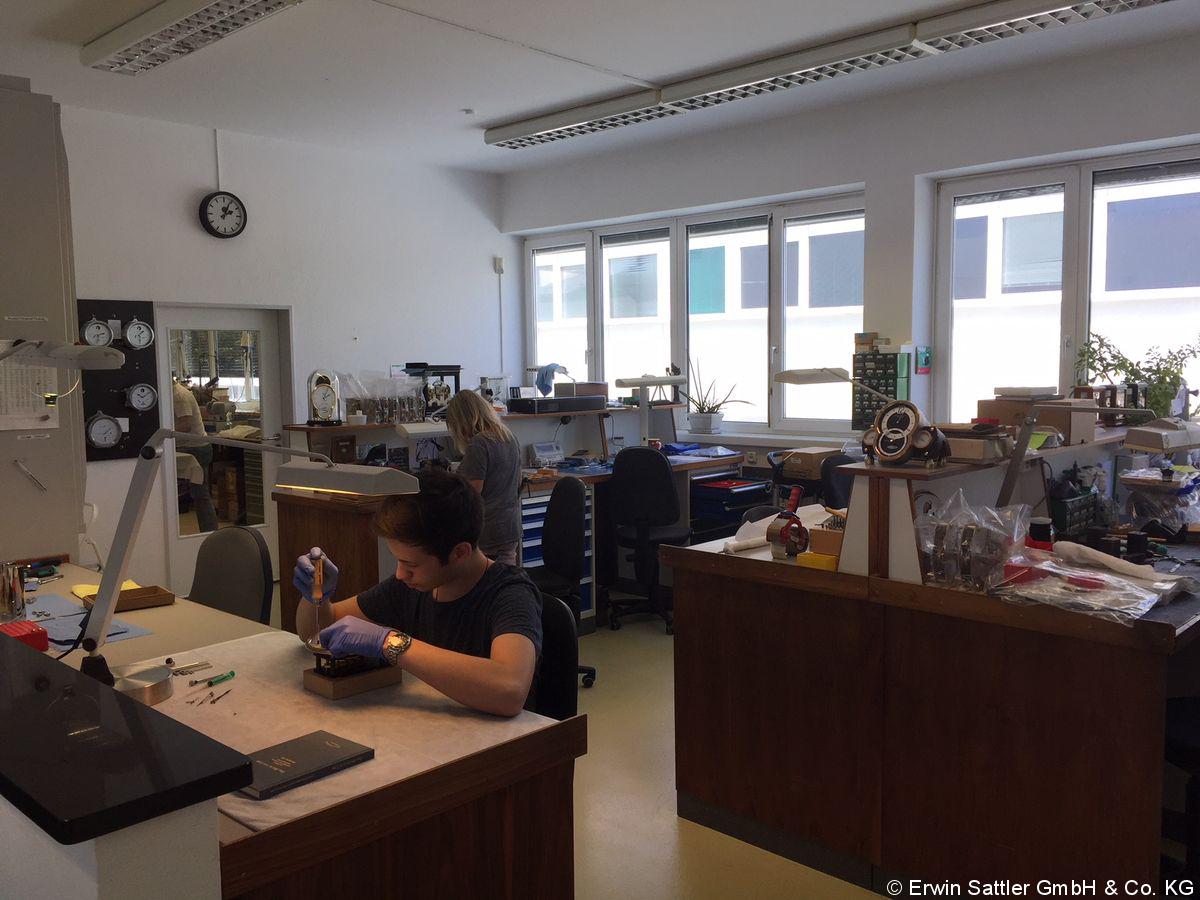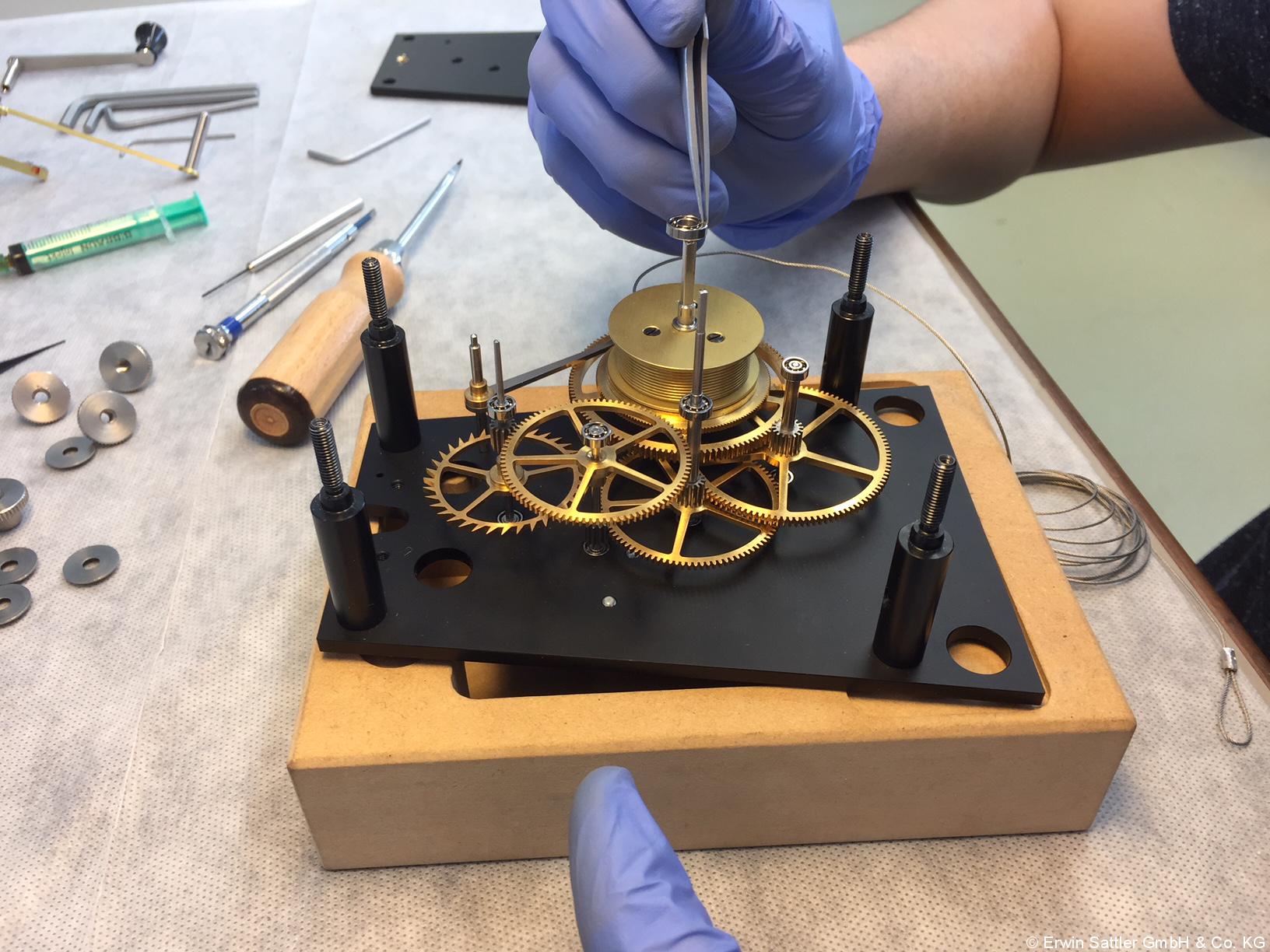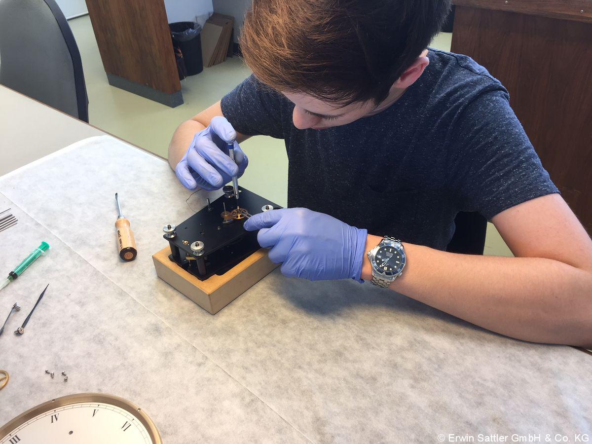 Julius lernt bei der Erwin Sattler GmbH & Co. KG, die Tisch- und Wanduhren produziert. Diese kostbaren Uhren finden sich dann in Büros und als Innenausstattung für Luxus-Häuser und Wohnungen. Besonders beliebt sind die Präzisionsgeräte bei chinesischen Kunden. Die Firma hat sogar eine extra Web-Seite auf chinesisch. Julius ist bei der Arbeit: Sein typisches Werkzeug: Uhrmacherschraubendreher, Pinzette und die Uhrmacherlupe. „Wer den Beruf des Uhrmachers lernen möchte, sollte gerne genau und ordentlich arbeiten“, sagt Julius.