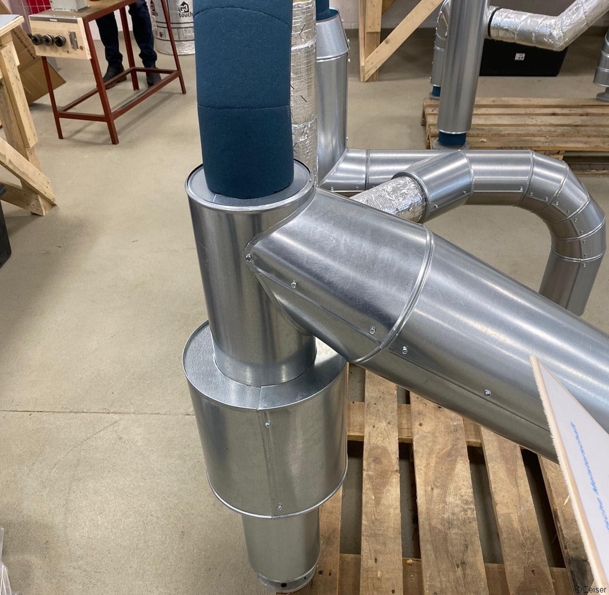 Bei den Rohren von Lüftungs- und Klimaanlagen, wie sie in größeren Bürokomplexen oder Industriegebäuden vorkommen, verwendet Luca synthetischen Kautschuk als Dämmung. „Dieses Material isoliert am besten gegen Kälte“, erklärt er und betont: „Wichtig ist, dass die Dämmung an den Stößen ganz dicht ist.“ Ansonsten könnte sich Schwitzwasser bilden. Das kann zu Wasserschäden führen. Befinden sich die Rohre im Außenbereich, kommt meistens noch eine Blechverkleidung drum.