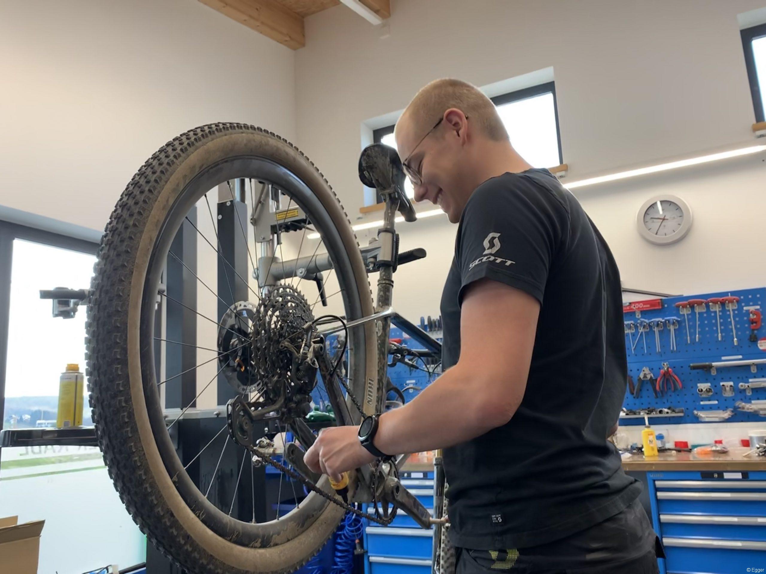 In der Werkstatt von Egger-Radl in Waldkirchen gibt es immer viel zu tun. Emil und seine Kollegen wechseln Schläuche, ziehen Bremsen und Speichen nach, reinigen Ritzel und Ketten, stellen Gangschaltungen neu ein. Dazu kommen Reparaturen an E-Bikes. „Die sind meistens aufwendiger“, berichtet Emil. Oft muss der Motor aus- und wieder eingebaut werden. Dann heißt es sämtliche Kabel neu zu verlegen. „Ein ganz schönes Gepfriemel manchmal“, grinst Emil. Das macht ihm nichts aus. Er freut sich, wenn die Räder wieder rund und leicht laufen und seine Kunden übers ganze Gesicht strahlen.